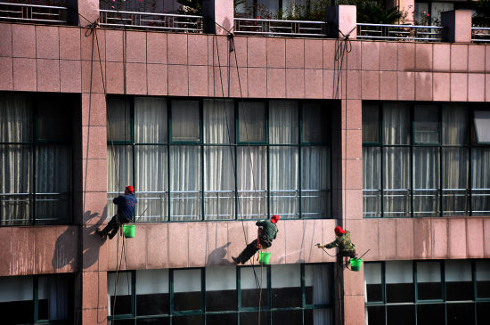 在信陽(yáng)某區(qū)一高層建筑外,外墻清洗人員“蜘蛛人”向師傅與工友正懸掛在高樓外體上小心且仔細(xì)地清潔外墻和玻璃,毛頭蘸著添加了清潔劑的水在玻璃上掃一遍,然后用刮子把水刮掉,原本臟兮兮的玻璃馬上煥然一新。對(duì)于向師傅而言,這只是他每天固定的工作而已。 一件專(zhuān)業(yè)的工作服,褲子上兩個(gè)鱷魚(yú)嘴似的大洞,膠皮手套戴在手上,向師傅的裝束表述著這份外墻清洗工作的臟、累、險(xiǎn)。聽(tīng)說(shuō)記者要采訪(fǎng)他,這個(gè)懸掛在樓層外體上的漢子對(duì)著攝影師的鏡頭做了一個(gè)憨厚的笑臉,然后又重新認(rèn)真刷起了外墻和玻璃。 一道刷到底,向師傅收拾起裝備坐電梯重新返回樓頂,移動(dòng)下4厘米粗的安全繩的位置,準(zhǔn)備重新開(kāi)始另一道。下去前,向師傅熟練地把安全繩綁定在樓頂一個(gè)堅(jiān)固的建筑上,來(lái)回反復(fù)拉扯幾下,以確保足夠地安全。十多年的高空作業(yè)讓這個(gè)憨厚且粗獷的漢子心細(xì)如發(fā)。 隨后,向師傅敏捷地抓住樓體外沿,把自己懸掛在通過(guò)專(zhuān)業(yè)的打結(jié)手法綁定在安全繩上的木板上,一系列的動(dòng)作一氣呵成。坐好后的向師傅沒(méi)有選擇立即下去,又仔細(xì)地把副繩綁好。“之前出過(guò)意外,下去前因?yàn)榇笠鉀](méi)有仔細(xì)檢查,主安全繩突然斷了,幸虧有副繩的二次保護(hù),不然后果不堪設(shè)想。人家摔一跤就摔了,我們摔一下那可就沒(méi)有再爬起來(lái)的機(jī)會(huì)了!